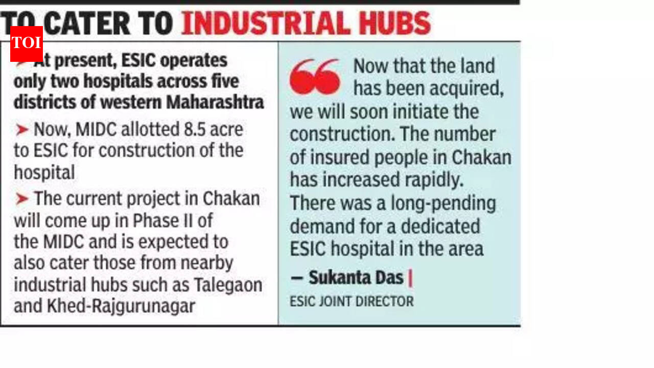 पुणे: महाराष्ट्र औद्योगिक विकास महामंडळ (MIDC) ने या महिन्याच्या सुरुवातीला सुविधेसाठी 8.5 एकर जागा दिल्यावर चाकण औद्योगिक पट्ट्याला पहिले कर्मचारी राज्य विमा महामंडळ (ESIC) संचालित 350 खाटांचे रुग्णालय मिळणार आहे.ESIC सहसंचालक सुकांता दास यांनी TOI ला सांगितले की ESIC योजनेंतर्गत समाविष्ट कर्मचाऱ्यांसाठी प्रत्येकी 100 खाटांची रुग्णालये उभारण्यासाठी महामंडळाने बारामती आणि सातारा येथे जमीनही मिळवली आहे.